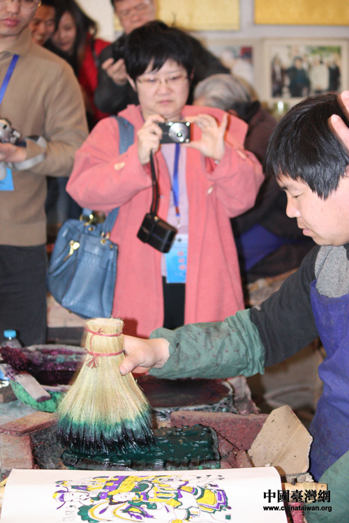 兩岸三地記者聯(lián)合采訪團(tuán)3月25日上午參訪河南開封朱仙鎮(zhèn)木版年畫(中國(guó)臺(tái)灣網(wǎng)記者 王文英 攝)