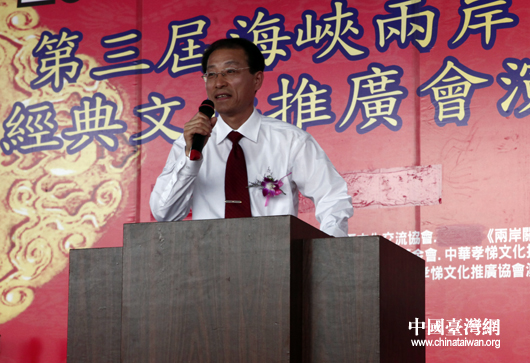 濟(jì)南市教育學(xué)會參訪團(tuán)團(tuán)長鄒衛(wèi)平在第三屆海峽兩岸經(jīng)典文化推廣會演致辭(中國臺灣網(wǎng) 邢同林 攝)