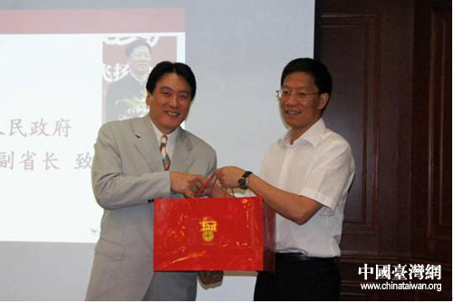 四川省委常委、副省長鐘勉(右)參觀考察臺灣統一集團,與統一集團總經理羅智先(左)互贈交換禮品。圖片來源:四川省臺辦