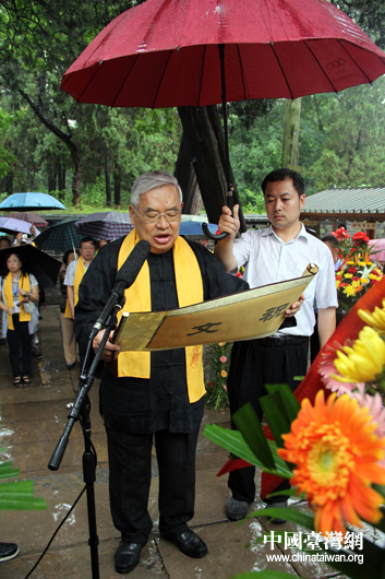 “情系齊魯——兩岸文化聯(lián)誼行”臺灣嘉賓團顧問、臺灣世新大學(xué)講座教授曾永義現(xiàn)場恭讀祭文。(中國臺灣網(wǎng) 芮益芳 攝)