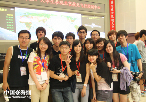 學(xué)生們?cè)诒本┖教祜w行控制中心參觀合影留念。(中國(guó)臺(tái)灣網(wǎng) 李瑞艷 攝)