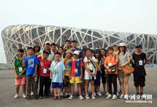 “臺(tái)灣原住民北京文教交流訪問(wèn)團(tuán)”在鳥(niǎo)巢前合影留念。(中國(guó)臺(tái)灣網(wǎng) 黃艷艷 攝)