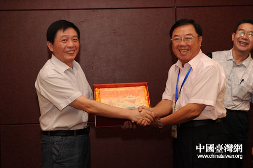 湖北省臺辦主任劉凱春向臺灣客人贈送紀(jì)念品。(湖北省臺辦 陸勝 攝)