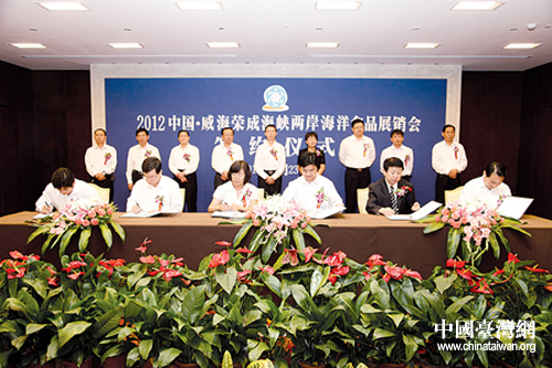 2012中國·威海榮成海峽兩岸海洋食品展銷會簽約儀式舉行。(圖片來源:威海市臺辦)