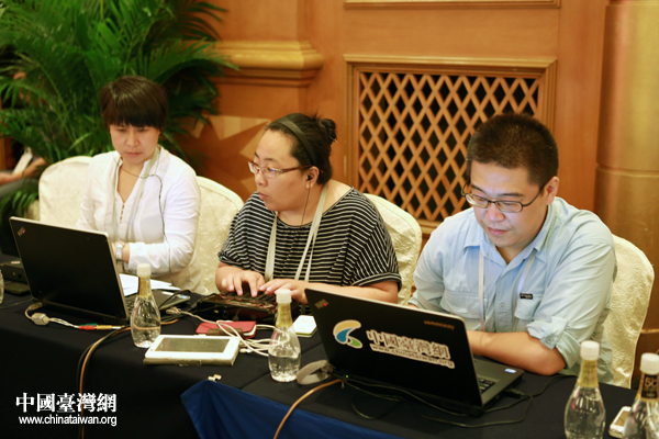 中國臺灣網(wǎng)記者在第八屆兩岸經(jīng)貿(mào)文化論壇閉幕式現(xiàn)場進(jìn)行文字直播。(中國臺灣網(wǎng) 于斯文 攝)