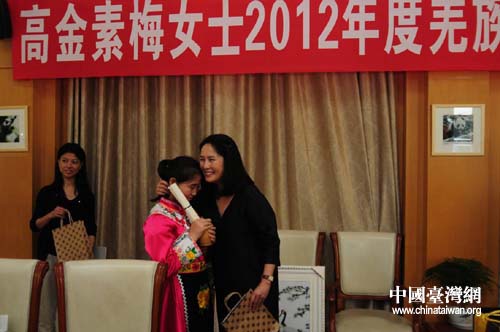 四川省臺辦副主任張軍在發(fā)放儀式上說,高金素梅女士5年來持續(xù)率臺灣少數(shù)民族參訪團(tuán)來川參訪交流,為災(zāi)區(qū)民眾祈福,助養(yǎng)北川羌族受災(zāi)學(xué)生,令我們感動不已。感謝高金素梅女士在推動四川與臺灣交流特別是兩地少數(shù)民族交流、青少年交流,以及傳承和彰顯兩岸同胞友愛互助等方面所付出的心血和貢獻(xiàn)。前不久,成都大熊貓繁育研究基地在西部首個入選海峽兩岸交流基地,成為了四川與臺灣交流合作的新平臺,歡迎更多的臺灣同胞到四川、到成都、到大熊貓基地交流參訪,共同推動四川與臺灣的交流持續(xù)深入開展。