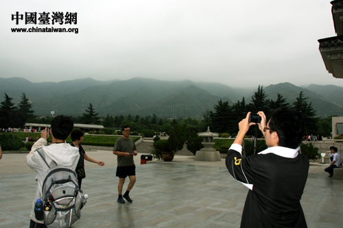 13日早晨,12名臺(tái)灣在校大學(xué)生和6名來自北京的大學(xué)生志愿者乘車來到西安市臨潼區(qū)驪山之北,秦始皇帝陵的所在。微微細(xì)雨中,驪山秀美的景色讓人為之精神一震,聽說群山之中有一座埋藏著未曾開挖的秦始皇陵墓,同學(xué)們紛紛舉起相機(jī)拍照留念。