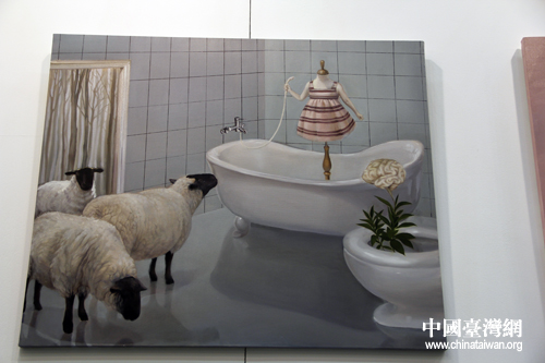 在臺(tái)灣藝術(shù)品展區(qū),記者還看到不少表達(dá)人類日趨物質(zhì)化、疏離冷漠的作品,不過(guò)也見到有描繪東北平原景象的畫作:1960年代風(fēng)貌的集市中,兩名面容敦厚的姑娘坐在路邊休息,身邊是巨大的菜籃、水壺與蔬果——透露出臺(tái)灣藝術(shù)家對(duì)大陸一個(gè)遙遠(yuǎn)年代的有趣想象。