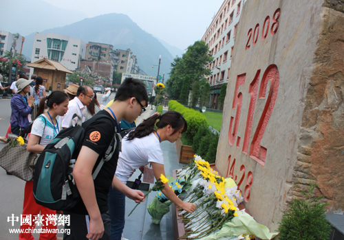 參訪團(tuán)一行為北川地震遇難同胞敬獻(xiàn)鮮花寄托哀思。(圖片來源:綿陽市臺辦)