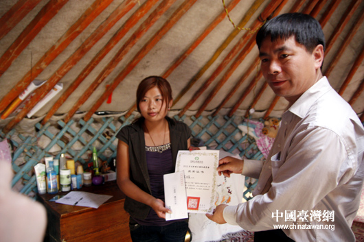額尼日樂(lè)的姐姐格根照拉從頂新公益基金會(huì)代表手中接過(guò)妹妹的獎(jiǎng)學(xué)金,心中感慨萬(wàn)端(中國(guó)臺(tái)灣網(wǎng) 蕪?fù)?nbsp;攝)
