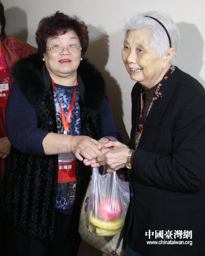 新北市中和區(qū)婦女會(huì)理事長林葉妹(左)為養(yǎng)老院老人送上水果,祝他們重陽節(jié)快樂。(中國臺(tái)灣網(wǎng) 郭瑩瑩 攝)