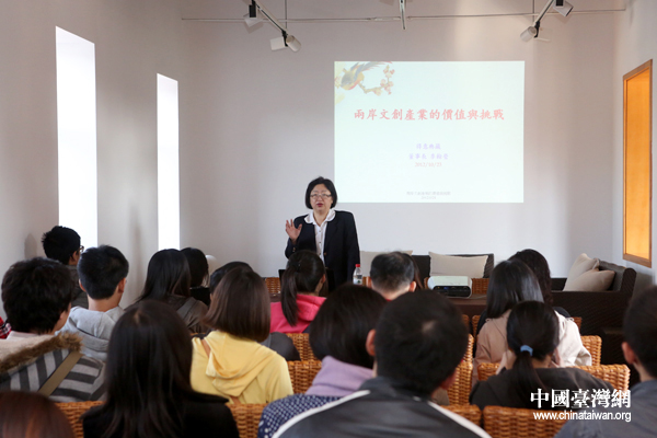 北京得意典藏公司董事長(zhǎng)、臺(tái)商李瀚瑩女士為同學(xué)們舉行了題為《兩岸文創(chuàng)企業(yè)的價(jià)值與挑戰(zhàn)》的講座,以親身經(jīng)歷為同學(xué)們?cè)诖箨懝ぷ骱蛣?chuàng)業(yè)提供了寶貴的經(jīng)驗(yàn)。(中國(guó)臺(tái)灣網(wǎng) 普燕 攝)