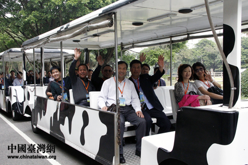 大陸基層農(nóng)民代表參訪桃園味全埔心牧場(chǎng),乘坐牧場(chǎng)特色游覽車(chē)。 (中國(guó)臺(tái)灣網(wǎng) 于斯文 攝)