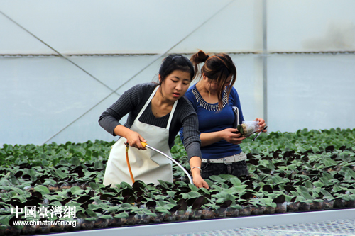 兩岸溫泉產(chǎn)業(yè)合作區(qū)的臺資展逸蘭花廠棚里,工人們正細心照料著蘭花幼株。(中國臺灣網(wǎng) 楊麗 攝)