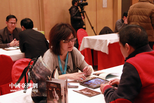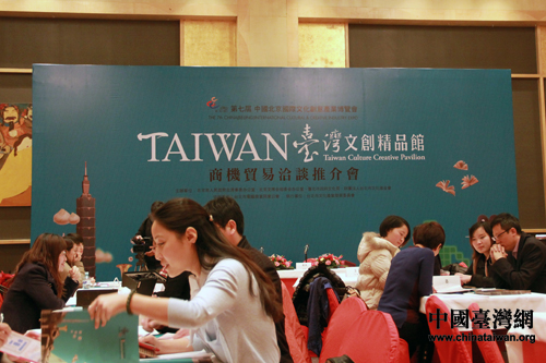 21日下午在京舉行的臺灣文創(chuàng)精品館商機貿(mào)易洽談推介會上,不少臺灣商家與大陸廠商一起洽談合作、招募商機。(中國臺灣網(wǎng) 楊麗 攝)