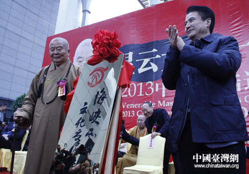 海南省委書記、省人大常委會(huì)主任羅保銘,臺(tái)灣佛光山開山宗長(zhǎng)星云大師為海峽兩岸(海南)文化交流聯(lián)合會(huì)和一筆字書法展揭牌(中國(guó)臺(tái)灣網(wǎng) 馬萌攝)