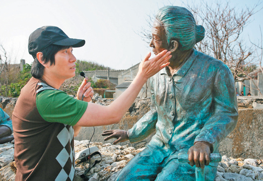 潘安邦2008年觸景傷情,輕撫外婆雕像臉頰。 圖片來自《聯(lián)合報(bào)》