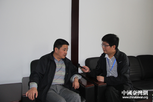 雅安市外事僑務(wù)臺灣工作辦公室副主任時勇(左)接受《兩岸關(guān)系》雜志社駐四川記者站記者采訪。(韓蕊 攝)