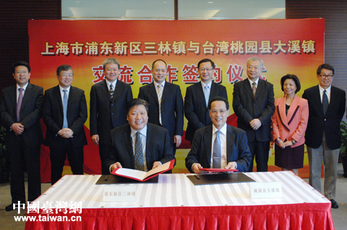 中國臺(tái)灣網(wǎng)4月28日上海消息 4月27日,上海浦東新區(qū)三林鎮(zhèn)與臺(tái)灣桃園縣大溪鎮(zhèn)簽署了民間文化交流合作備忘錄。上海市政協(xié)副主席、浦東新區(qū)區(qū)長姜樑和臺(tái)灣桃園縣長吳志揚(yáng)見證了簽署儀式。