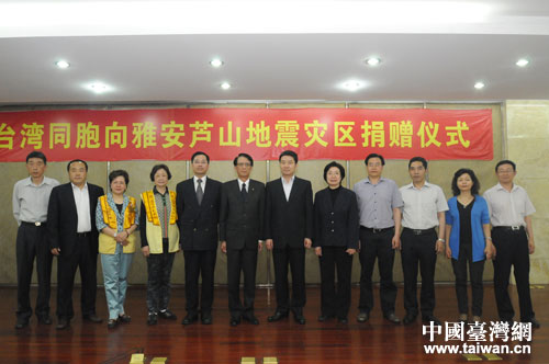 4月27日下午,臺灣同胞向四川蘆山地震災(zāi)區(qū)捐贈儀式在四川成都舉行。 圖片來源:四川省臺辦
