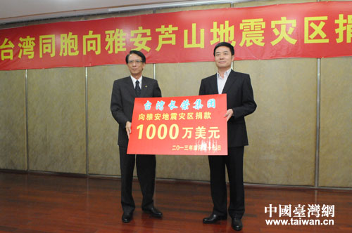 捐贈儀式上,長榮集團(tuán)捐款1000萬美金(約合6170萬元人民幣),是目前向雅安蘆山地震災(zāi)區(qū)捐款數(shù)額最多的臺資企業(yè);大潤發(fā)捐贈1000萬元人民幣,包括300萬元資金和700萬元物資;臺灣宗教團(tuán)體佛光山捐款1000萬新臺幣(約合208萬元人民幣);新光三越百貨股份有限公司捐款100萬元人民幣。四川省副省長甘霖出席捐贈儀式,并代表四川省人民政府接受臺灣同胞捐贈。