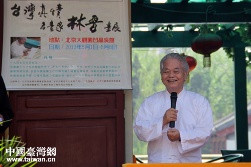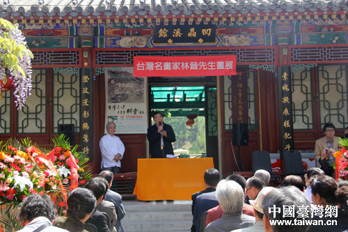 1日上午,臺灣著名畫家林晉先生畫展首次在京展出。書畫展以“臺灣真情”為主題,共展出作品30余幅。圖為林晉先生在開展儀式上。(中國臺灣網(wǎng) 楊麗 攝)