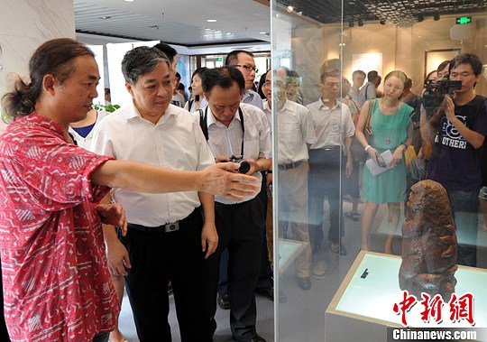 圖為出席該圖片展開幕式的金門陶藝家王明宗(左)攜風(fēng)獅爺首秀福州。作為閩臺共同的民間信仰,風(fēng)獅爺是金門的守護(hù)神,距今最久遠(yuǎn)有320年歷史,目前島上共有72尊,各異其趣,是金門非常珍貴文化資產(chǎn)。劉可耕 攝