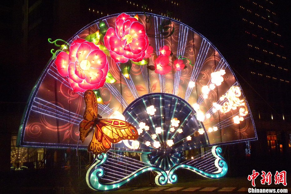 薈萃兩岸傳統(tǒng)文化的首屆海峽兩岸(昆山)中秋燈會9月14日晚首度試燈,當(dāng)晚60多組大型燈組、30萬平方米七大主題燈區(qū)美輪美奐。一組組流光溢彩的花燈呈現(xiàn)著兩岸相近的中秋民俗傳統(tǒng)、文化風(fēng)貌以及風(fēng)格各異的江南水鄉(xiāng)元素、臺灣媽祖文化等特色文化,兩岸民眾喜聞樂見的花卉、寓意吉祥的文化元素交相輝映。圖為燈組國色天香,以“花中之王”牡丹為主題,慢慢綻放,扇面采用現(xiàn)代光雕材質(zhì),構(gòu)成花開富貴的吉祥圖案。黃瑩 攝