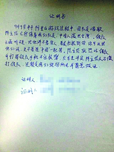 為了確證自己所言無誤,王磊向北青報記者提供了一份由團里兩名游客書寫的證明書,并準(zhǔn)備作為以后打官司的證據(jù)。該文肯定了因唱歌遭到臺北男子辱罵后,王磊前去和解,但遭繼續(xù)挑釁并被打掉手機而發(fā)生沖突的事實,“過程是我們現(xiàn)場所見并愿意作證”。王磊向北青報記者提出保護證明人信息的申請,北青報記者隱去了兩位游客的姓名及電話。