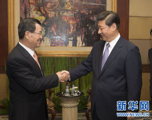 10月6日,中共中央總書(shū)記習(xí)近平在印度尼西亞巴厘島會(huì)見(jiàn)臺(tái)灣兩岸共同市場(chǎng)基金會(huì)榮譽(yù)董事長(zhǎng)蕭萬(wàn)長(zhǎng)一行。 新華社記者蘭紅光攝