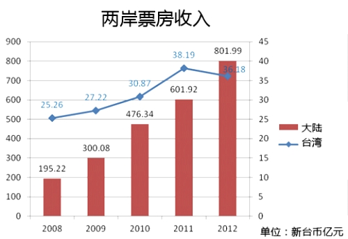 消息說,兩岸軟實(shí)力抬頭,兩岸不約而同地將文化創(chuàng)意產(chǎn)業(yè)列為未來十年的重點(diǎn)發(fā)展產(chǎn)業(yè),其中大陸在電影產(chǎn)業(yè)的成長進(jìn)入高速發(fā)展期。2012年已經(jīng)超越日本,成為全球第二大票房地,全年票房達(dá)新臺(tái)幣801.99億元(約27億美元)。