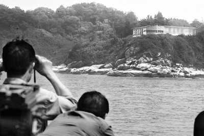 大陸游客從船上遠(yuǎn)眺“心戰(zhàn)墻”。