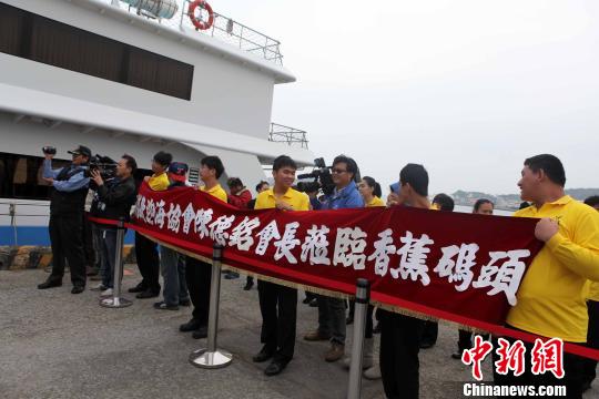 在高雄港4號碼頭,陳德銘一行受到熱情歡迎。有碼頭人員打出歡迎的橫幅,并高喊“陳會長,我愛你”。(記者 董會峰)
