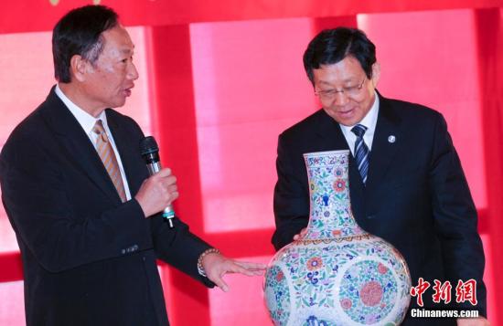 郭臺(tái)銘代表鴻海,向陳德銘致贈(zèng)一個(gè)斗彩唐草團(tuán)花天球瓶,寓意兩岸和平、經(jīng)合順利。另贈(zèng)送專(zhuān)門(mén)為母親訂作的鳳梨酥,郭臺(tái)銘笑言“絕對(duì)保證食品安全”,引來(lái)一陣掌聲。