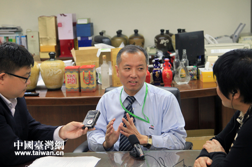 記者采訪金門高粱酒廠總經(jīng)理吳秋穆。(李建偉 攝)