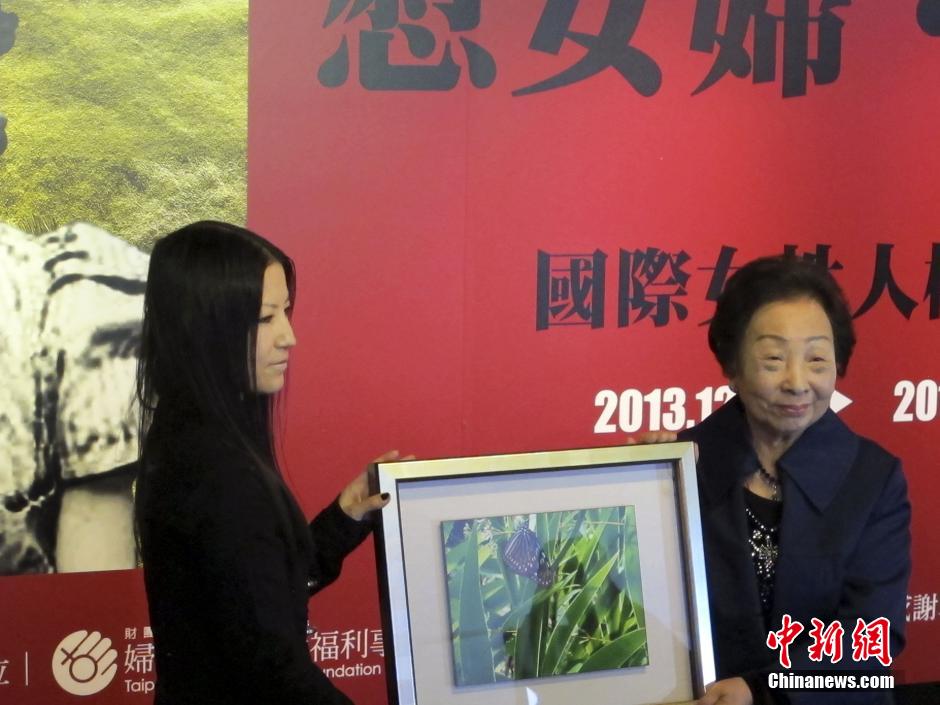 12月9日,臺(tái)灣婦女救援基金會(huì)邀請由韓裔美籍藝術(shù)家李昌珍女士策劃的“慰安婦招募”展覽在臺(tái)北展出。該展由李昌珍女士自2008年起前往中國大陸、臺(tái)灣、韓國等地,收集大量慰安婦史料,并以多媒體視頻、仿公告海報(bào)、模擬重建慰安所等形態(tài)展出。圖為臺(tái)灣慰安婦代表、年逾90的陳蓮花阿嬤(右)向李昌珍贈(zèng)送自己的攝影作品。中新社發(fā) 葉小剛 攝