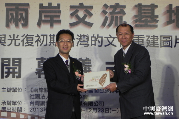 《兩岸關(guān)系》雜志社副社長鐘河林與臺(tái)南市文化協(xié)會(huì)顧問張先鵬互換禮品。(劉麗華攝)