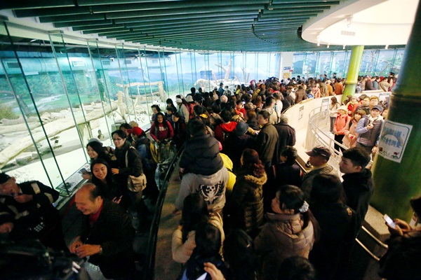 動(dòng)物園門(mén)口清晨5、6時(shí)就出現(xiàn)搶看“圓仔”的頭香客,每個(gè)人都是全副武裝,包得緊緊就為了看“圓仔”。截至動(dòng)物園9時(shí)開(kāi)園前,排隊(duì)人龍已經(jīng)延伸至捷運(yùn)動(dòng)物園站,約有500、600人。