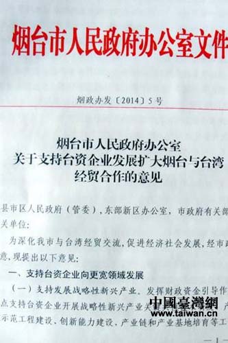 煙臺市政府出臺支持臺資企業(yè)發(fā)展的意見。