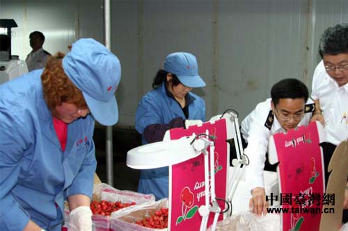 檢驗(yàn)檢疫工作人員對(duì)煙臺(tái)大櫻桃進(jìn)行檢驗(yàn)。