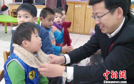 10日,在臺灣桃園縣一家私立身心障礙兒童照護(hù)機(jī)構(gòu)寶貝潛能發(fā)展中心,近20位2至6歲兒童戴上充滿兩岸愛心的各色漂亮圍巾,高興地笑了。