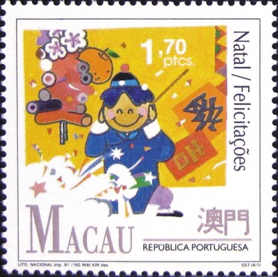 澳門1991年11月29日發(fā)行一套4枚《祝賀》郵票,其中一枚中式打扮的男童燃放鞭炮(圖②),背景可見桃花、年橘、倒貼的“!弊趾陀∮小凹弊值睦欠,洋溢著濃郁的過年氣氛。