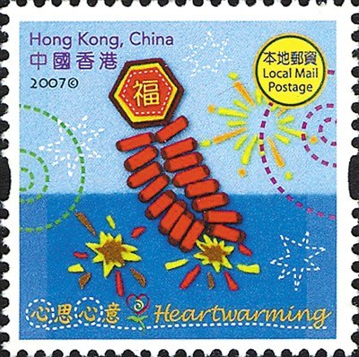 香港2007年12月28日推出的一套4枚《心思心意》郵票,有一枚直接以一掛燃放的鞭炮為主圖(圖③),鞭炮上端還印著一個(gè)大大的“!弊,構(gòu)圖簡(jiǎn)潔明了,寓意深刻。(文/司徒一凡)