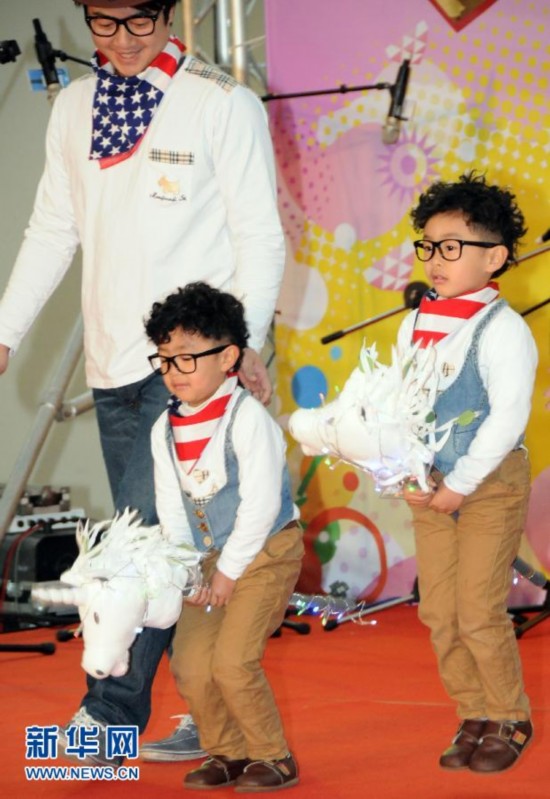 2月15日,雙胞胎陳昱菘(右)、陳昱齊(左)打扮成牛仔造型走秀。當日,臺北市舉辦第二屆“雙胞胎幸福總動員”活動,415對雙胞胎和三胞胎家庭齊聚一堂,分享成長經(jīng)驗。 新華社發(fā)(吳景騰 攝)