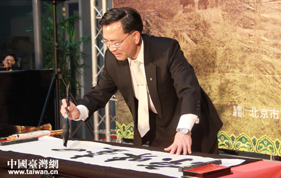臺中市副市長蔡炳坤寫下“京味臺中”四個大字,預祝本屆“京味”交流活動在臺中首秀成功圓滿。(中國臺灣網 高斯斯 攝)