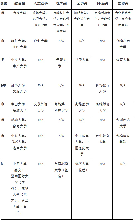 被推薦院校表示在該縣市綜合實力最強(qiáng)或在不同領(lǐng)域享有盛名,其中綜合性一類院校通常在各領(lǐng)域均頗有建樹,不再放入其他領(lǐng)域院校推薦。另外,表中師范類院校不表示必須入讀師范類專業(yè),而如前所述,臺灣師范類院校在人文社科及藝術(shù)領(lǐng)域均表現(xiàn)優(yōu)越,可考慮這類學(xué)科。
