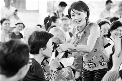 5月24日,臺(tái)北市林安泰古厝民俗文物館舉辦“吟詩饗宴”活動(dòng),邀請(qǐng)臺(tái)灣老、中、青三代詩人聯(lián)袂演出,共同迎接端午節(jié)的到來。圖為臺(tái)灣歌仔戲名家、臺(tái)灣戲曲學(xué)院歌仔戲系教授黃香蓮帶領(lǐng)觀眾一同吟唱古詩文。吳景騰攝(新華社發(fā))