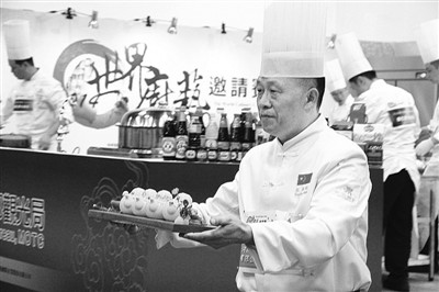 2014臺灣美食展8月15日至18日在臺北舉行。圖為美食展舉辦的世界廚藝邀請賽上,來自河南“阿五美食”的師傅把功夫菌湯端向評委席。