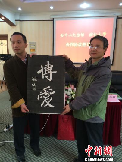 在簽約儀式上,輔仁大學(xué)向南京孫中山紀(jì)念館贈(zèng)送了臺(tái)灣中山樓的重要出版資料!∩耆健z