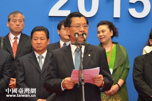 臺灣貿(mào)易中心董事長梁國新出席2015天津臺灣名品博覽會開幕式并致辭。(中國臺灣網(wǎng) 張潔 攝)